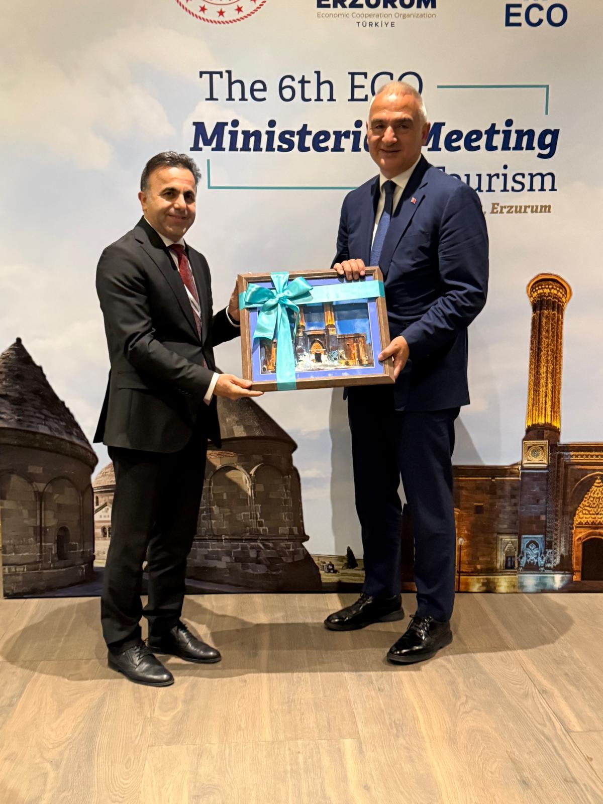 Ekonomik İşbirliği Teşkilatı (EİT) 2025 Turizm Başkenti Erzurum, Palandöken Ekonomi Forumu kapsamında şehrimize teşrif eden Kültür ve Turizm Bakanımız Sayın Mehmet Nuri Ersoy'a İl Müdürümüz Ahmet Yer tarafından Erzurum’un kültürel mirasını yansıtan, üç boyutlu rölyef sanatından yapılmış Çifte Minareler tablosu takdim edildi.