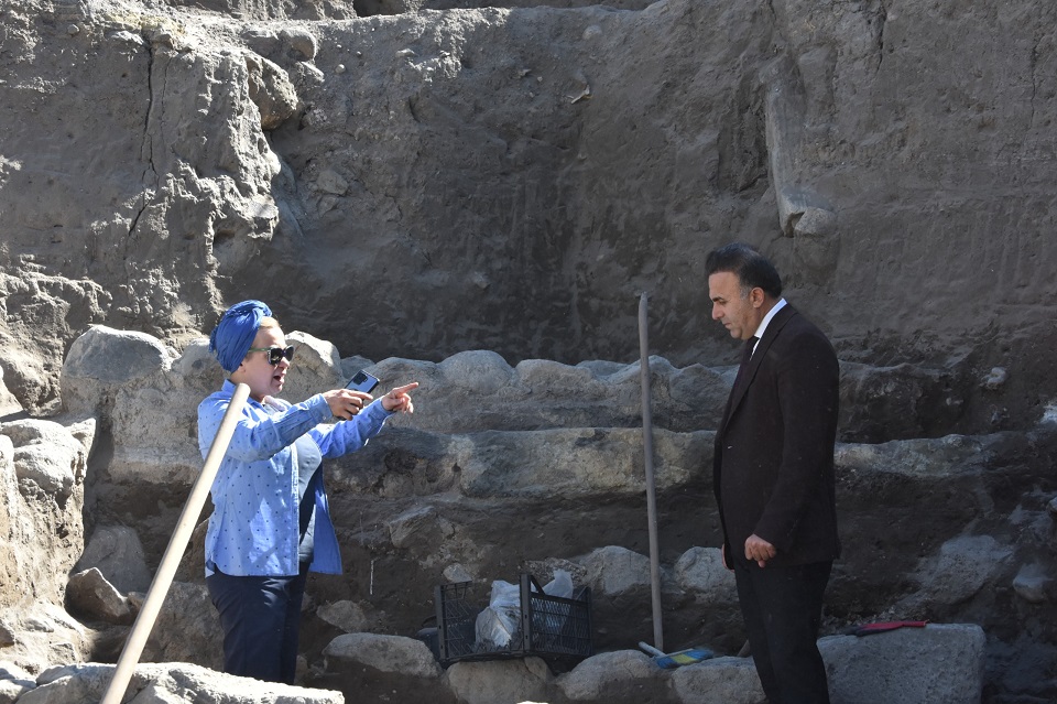 İl Müdürü Ahmet Yer kazı alanında incelemelerde bulunarak, Arkeolog Doç. Dr. Gülşah Altunkaynak'tan kazı alanı çalışmaları hakkında bilgi aldı.